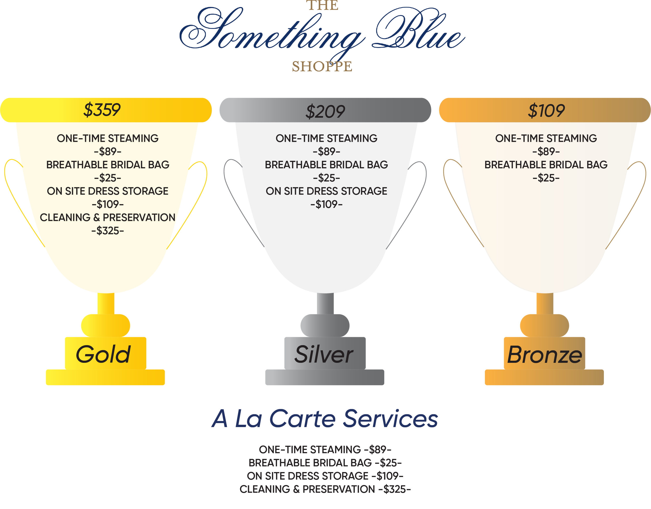 This project involved creating a clear and appealing visual system for tiered bridal packages. I used illustrated trophy cups to represent the Gold, Silver, and Bronze tiers and paired that with pricing and service breakdowns in a spreadsheet-style layout. The concept was provided by the store owner, and I executed it from visual concept to final design.