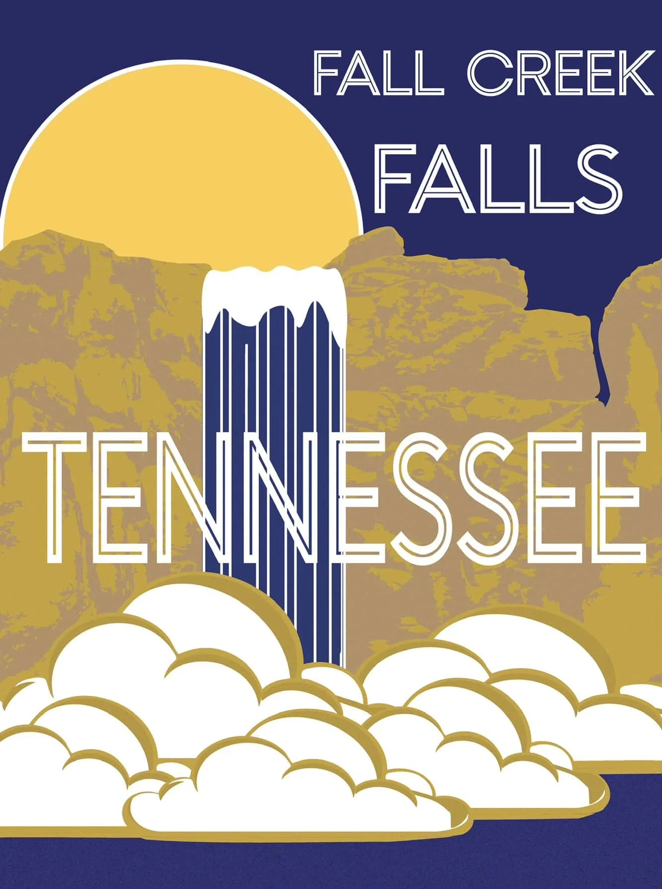 This poster was designed for Fall Creek Falls State Park in Tennessee using a limited color palette and bold typographic treatment. The goal was to create a stylized, travel-poster-inspired look that could function as both print and digital signage.