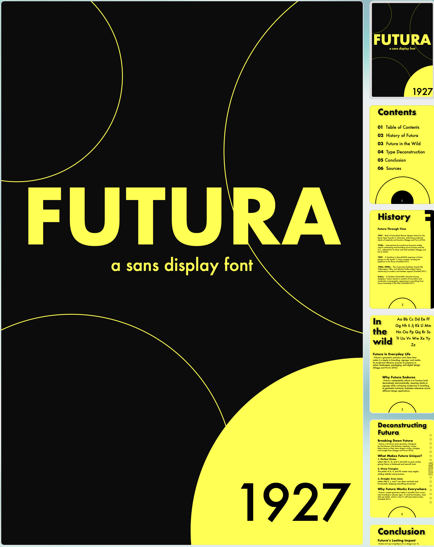 An experimental layout booklet exploring the history of the sans serif typeface Futura. The project involved organizing historical facts and visual data into a compelling, stylized layout with high contrast and custom grid work.